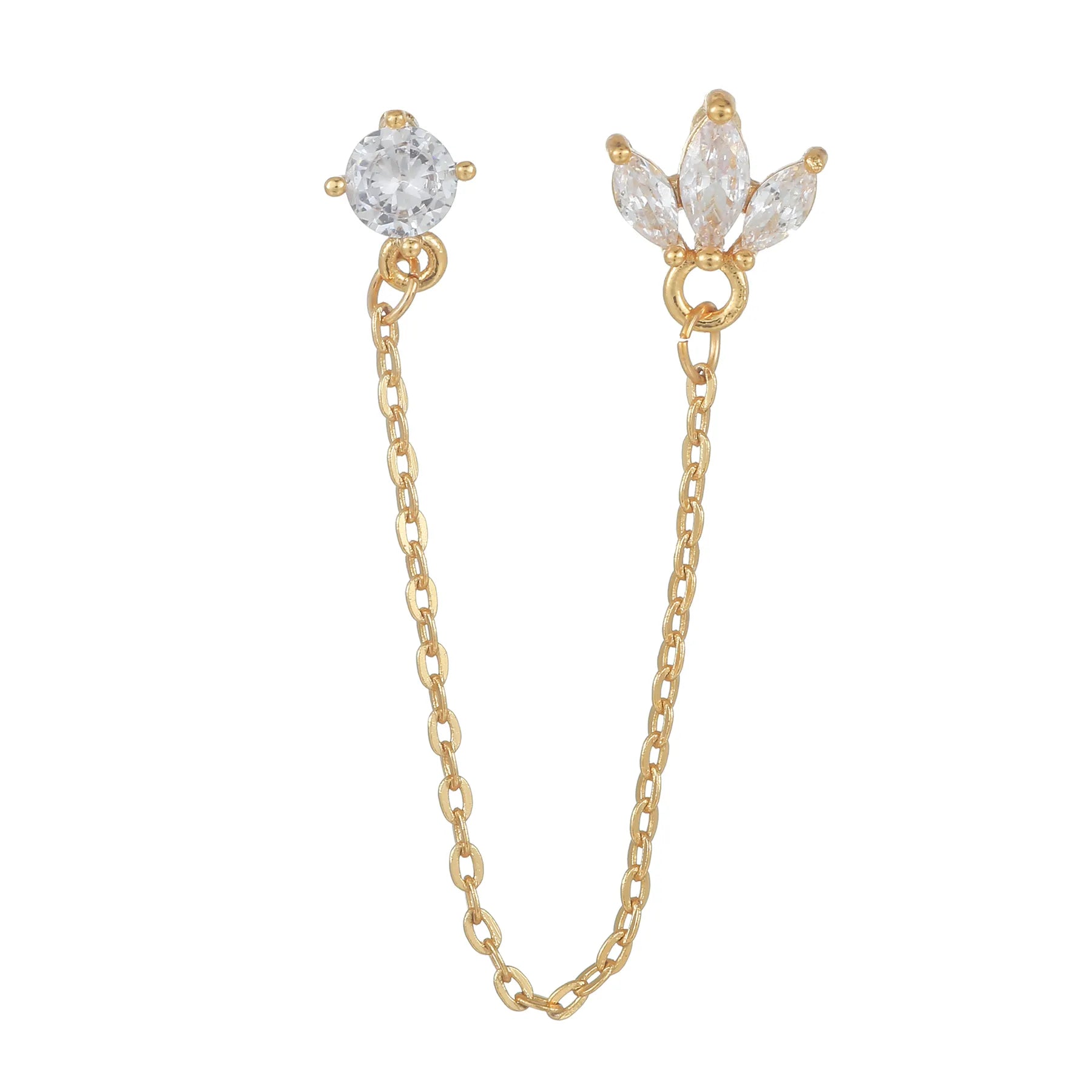 Make a subtle statement with our Lotus Chain Connecter. This unique design features a brilliant round-cut stud paired with a trio of marquise stones, gracefully connected by a fine gold chain. Create a look that’s effortlessly elegant and full of movement — perfect for adding a modern, whimsical touch to your everyday style.